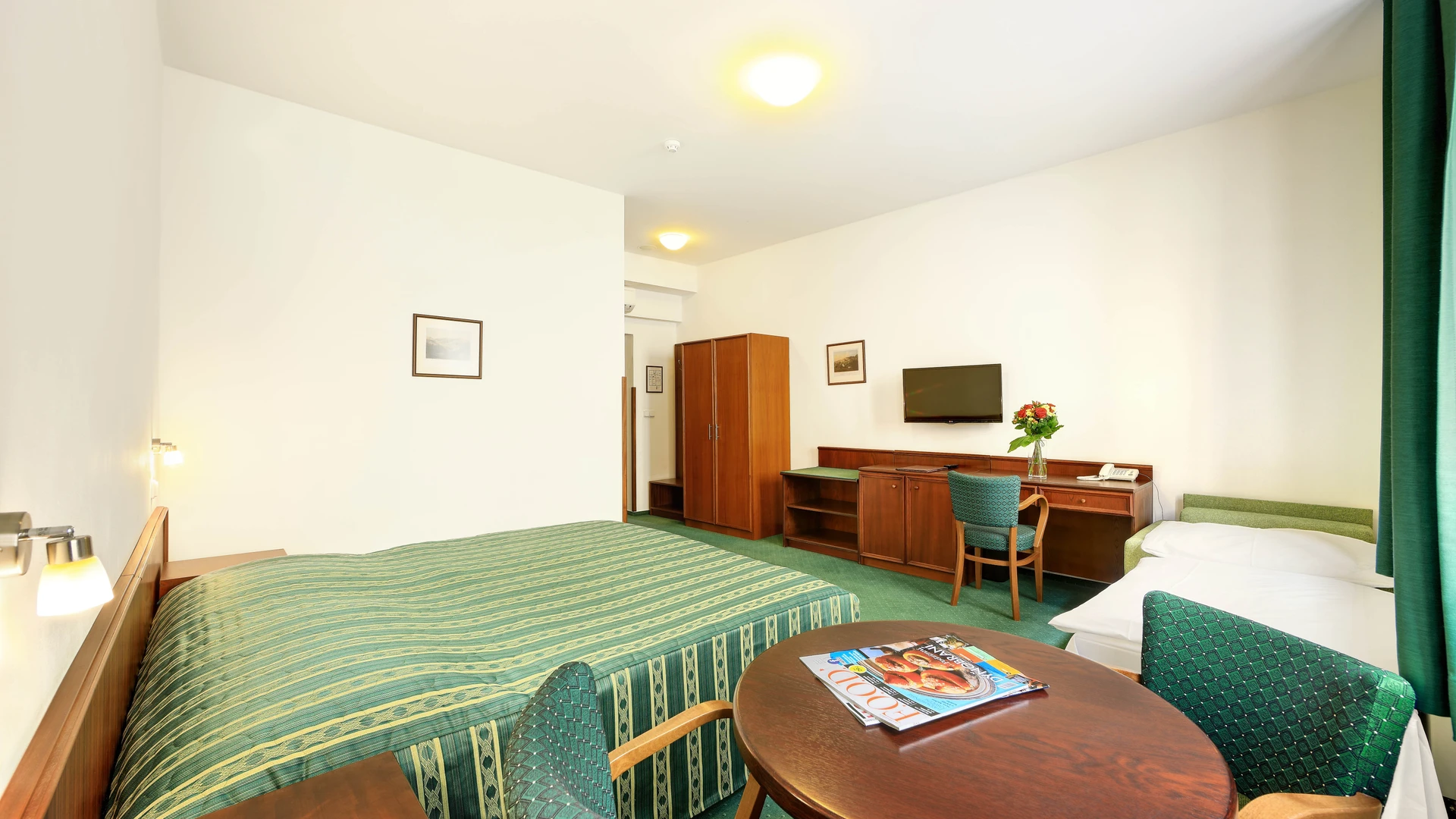 Triple rooms City view are large enough and comfortable. They are equipped with two beds 90x200 cm (double and single bed), SAT TV, safe, minibar, desk, wardrobe, hanger and bathroom with toilet, bathtub, hairdryer and hotel cosmetics. Room size min. 22 m2.